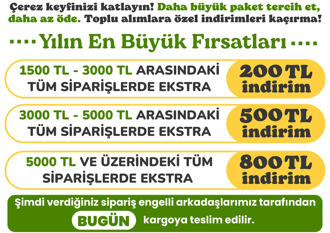Kuruyemişleriniz ve kuru meyveleriniz gerçekten efsane, ilginizle müşteri memnuniyetine verdiğiniz değer takdire şayan. Herkese tavsiye ederim, gönül rahatlığıyla alışveriş yapabilirsiniz.Betül E.